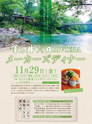 株式会社リビエラ東京は、60名様限定で「澤乃井×リビエラ メーカーズディナー」を開催いたします。東京の地酒を代表する”澤乃井”の小澤酒蔵株式会社より代表の小澤順一郎氏をお招きし、日本酒や酒造にまつわる興味深いお話を伺います。銘柄を一層引き立てる、この日限りの特別料理と、筝をはじめとした邦楽の生演奏による、極上のひとときをお楽しみいただけます。