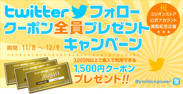 上記期間中、ミリオンストア公式twitterアカウントにフォローいただいた方全員に、スペシャルクーポン1,500円※をプレゼントさせていただきます。