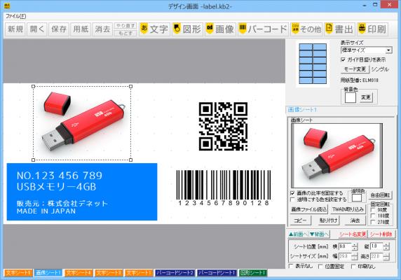 文字や図形の作成、画像の取込やバーコード作成ができる各専用シートにて編集を行います。