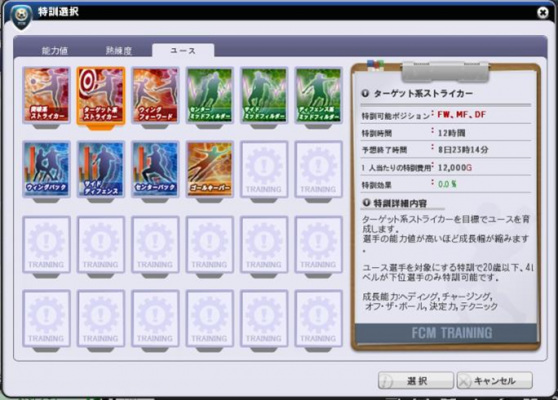 20歳以下で4レベル以下の選手はユースの特訓を受けさせることが出来ます。通常の特訓とは違い、複数の項目を同時に上昇させることが出来る上に、費用も安めです。