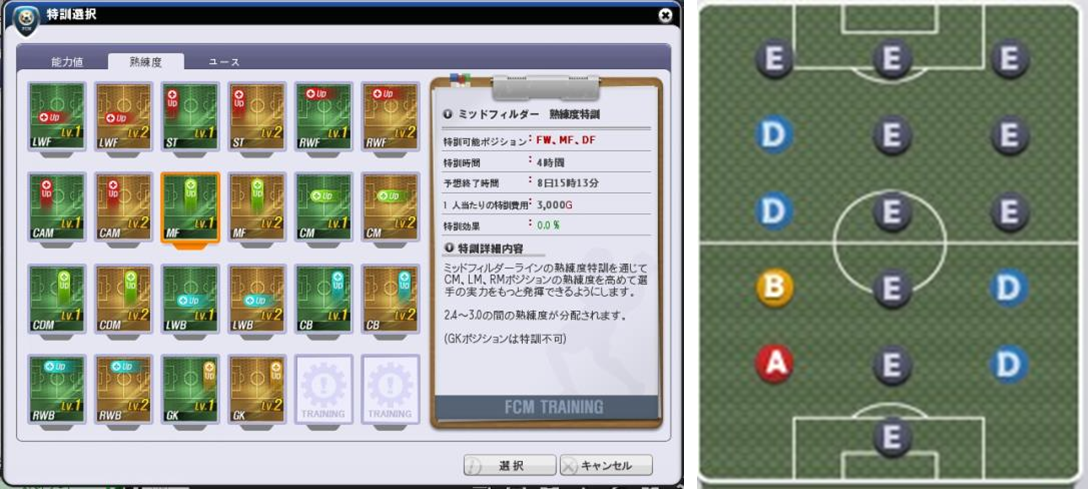 『FCマネージャー』では、攻撃的なポジションから守備的なポジションまで、幅広いポジション設定ができます。熟練度はA~Eまであって、Aに近づくほど選手のパフォーマンスが上がります。