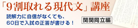 この『9割取れる現代文・関関同立』講座は、関関同立(関西大、関西学院大、同志社大、立命館大)の現代文の対策講座を、PC、スマホ、タブレットで受講できるサービス。全26回の講座と各学部の傾向と対策の解説が用意され、テキストはサイト上からダウンロードできる。「読解力」そのものを上げる講座ではなく、「問題のここを読めば、正答が分かる」というノウハウを教える講座である点が特徴。価格は28,400円(税抜)に設定し、大手サテライト予備校などで同程度の時間収録した映像講座の半額以下の価格で提供する。