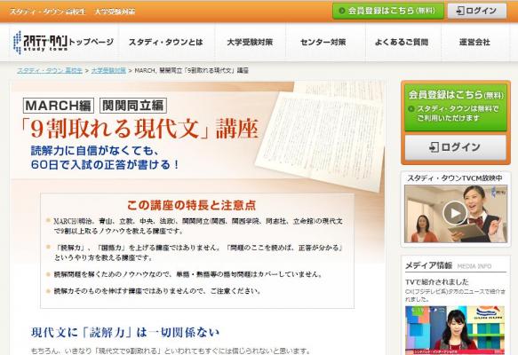 株式会社シンドバッド・インターナショナル(東京都渋谷区)は、2013年11月6日、同社が運営する会員制Eラーニングサービス『スタディ・タウン』(http://www.studytown.jp/)において、大学受験対策用の映像授業『9割取れる現代文・関関同立』講座(夏目啓伍講師)を配信開始した。