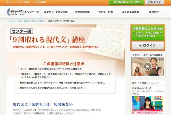 株式会社シンドバッド・インターナショナル(東京都渋谷区)は、2013年11月6日、同社が運営する会員制Eラーニングサービス『スタディ・タウン』(http://www.studytown.jp/)において、大学受験対策用の映像授業『9割取れるセンター現代文』講座(夏目啓伍講師)を配信開始した。