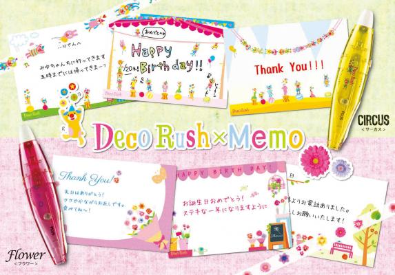 プラス株式会社(本社:東京都港区 代表取締役社長:今泉公二)は、ノートや手帳を簡単に可愛く飾れるペンタイプのデコレーションテープ「デコラッシュ」から、自分オリジナルの可愛いサーカス団や花束のメモが作れるデコラッシュとメモがセットになった「デコラッシュ 数量限定 メモキット」2種を2013年11月28日に発売します。