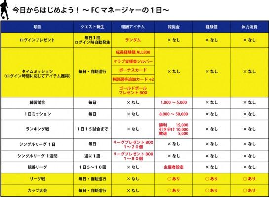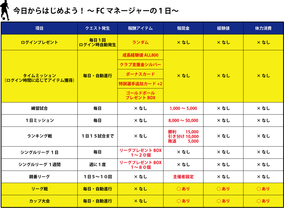 上のリストは、CBT中の『FCマネージャー』の一日でできること、起こることのまとめです。