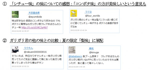 →これは、一部の店舗が、発売日前に「シチュー味」を販売し、いち早く入手したユーザがその感想を投稿し、その反響が盛り上がったため。 これらの事実から、「シチュー味」に関するTwitterユーザの関心が高いことが分かった。