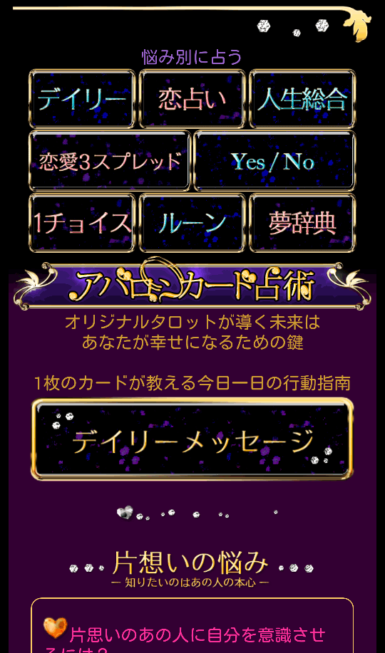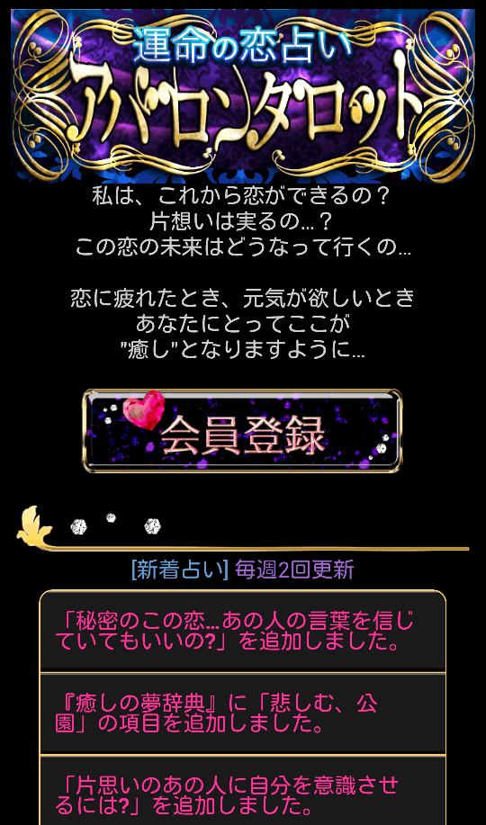 【運命の恋占い◆アバロンタロット】は、2007年3月にau公式サイトとしてリリースされた老舗人気占いサイトです。