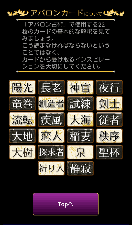 運命の恋を掴むためのアドバイスが欲しいとき、人生に迷ったとき、カードがあなたの道標となってくれるでしょう。ケルト神話に伝わる「癒しの島」と呼ばれる架空の島“アバロン”の名を持つこの占いが、あなたの心を癒す場所となりますように。