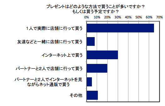 クリスマスプレゼントの購入方法については一番多い回答が「1人で実際に店舗に行って買う」(65%)となった一方で、「インターネット上で買う」と回答した方が30%と2番目に多くなり、3人に1人が、プレゼントをネット通販で購入していることが分かりました。クリスマスの時期はイベントや仕事で忙しくなる方も多くなるため、店舗に足を運ぶことなく気軽に購入できるネット通販も人気であることが予想されます!