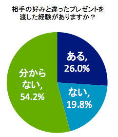 渡すプレゼントに悩んだ経験のある方も多いと思うのですが、「相手の好みと違ったプレゼントを渡した経験がありますか?」という質問に対しては、「ない」と回答した方がなんと全体の19.8%、2割以下にとどまりました!約半数の方が「分からない」と回答していることからも、プレゼントに対して自信がない方が多くいらっしゃることが明らかとなりました。