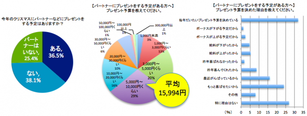 プレゼント予算については「5,000円~10,000円くらい」(29%)と回答した方が一番多く、平均では15,994円となりました。また、その予算を決めた理由についてダントツで多かった回答が「毎年だいたいプレゼント予算を決めている」(32%)というもの。景気や給料などに惑わされることなく、予算を決めているしっかり者の方が多いのかも?!