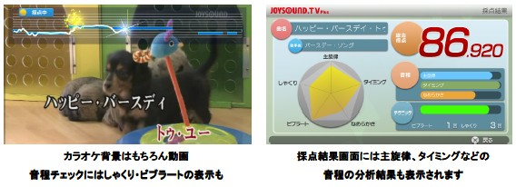 業務用通信カラオケ「JOYSOUND」でも人気の分析採点を「JOYSOUND.TV Plus」 でも実現しました。ビブラートやしゃくりの回数のほか、音程など詳細な 分析結果を表示できます。(※3)