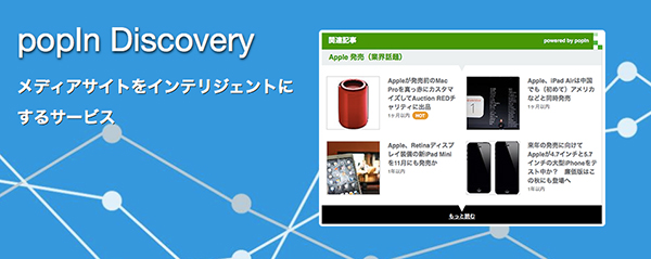 popIn株式会社(本社:東京都文京区 代表者:代表取締役 程 涛 以下、popIn)は、優良ニュースメディアサイト向けに、メディアサイトをインテリジェントにするサービス「popIn Discovery」を11月18日にリリースいたしました。popInはこれまでYOMIURI ONLINE、毎日JP、ロイターを含む50以上の大手メディアサイトに関連記事・サイト内検索のサービスを提供してまいりました。そのノウハウを凝縮して発展させたサービスが「popIn Discovery」です。