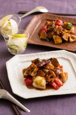 「主菜: 秘伝の黒酢ソース香る!秋野菜の酢鶏、副菜:キャベツ、かぶ、青ザーサイの香味油和え」