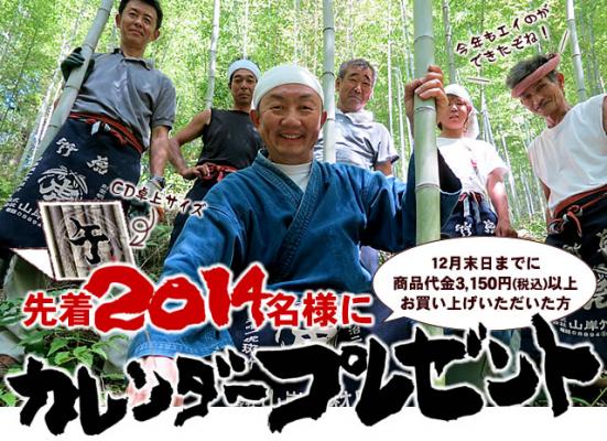 2013年12月末日までに、3,150円(税込)以上お買物頂いたお客様へ、2014年竹虎カレンダーをプレセント。先着2014名様までとなっており、カレンダーがなくなり次第終了いたしますのでお気を付け下さい。竹虎四代目をはじめ、高知県須崎市安和の虎竹の里や、日本唯一の虎斑竹、竹職人などなど…来年も皆様が心を躍らせ、待ち遠しくなるような商品を、たくさんお届けしていきますので、何卒よろしくお願いいたします。