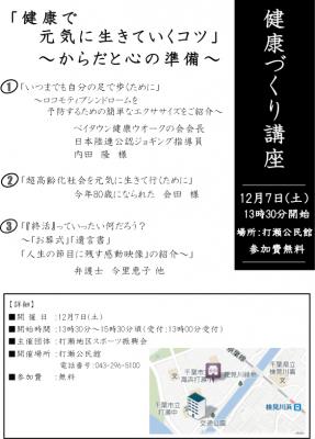 人生の節目に感動をつくる、株式会社リベント(本社:東京都港区 代表取締役社長:三上力央、以下リベント)が提供する葬儀サービス『花葬儀(http://www.hana-sougi.com/)』は、2013年12月7日に幕張打瀬公民館にて、ベイタウン健康ウオークの会と共催で、「健康で元気に生きていくコツ~からだと心の準備~」と題して健康づくり講座を開催いたします。参加費は無料ですので遊びに来られてはいかがでしょうか。