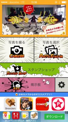 かめカメラとは摩貫光殺砲(マカンコウサッポウ)、波動拳、かめはめ波風の漫画コラージュ写真をスタンプを使って簡単に作ることが出来る写真加工アプリです。リリース10日で10万ダウンロードを達成し、その後もLINEや各種SNSに置けるユーザーの口コミを中心に順調に数字を伸ばし2013年11月20日に70万ダウンロードを達成致しました。作成された約250万枚の写真の内、25万枚以上がLINEや各種SNSで共有されており、仲の知れた友人、家族の間での拡大をしております。