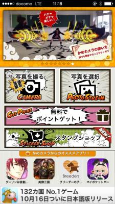 かめカメラとは摩貫光殺砲(マカンコウサッポウ)、波動拳、かめはめ波風の漫画コラージュ写真をスタンプを使って簡単に作ることが出来る写真加工アプリです。リリース10日で10万ダウンロードを達成し、その後もLINEや各種SNSに置けるユーザーの口コミを中心に順調に数字を伸ばし2013年11月20日に70万ダウンロードを達成致しました。作成された約250万枚の写真の内、25万枚以上がLINEや各種SNSで共有されており、仲の知れた友人、家族の間での拡大をしております。