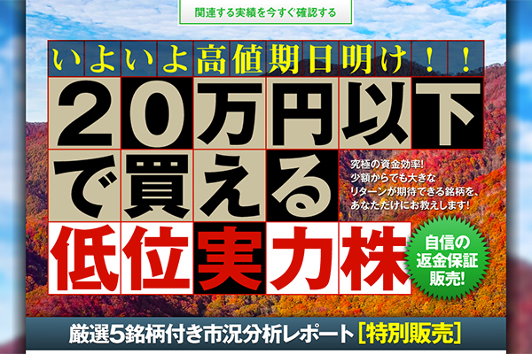 ・商品名:厳選5銘柄付き市況分析レポート「いよいよ高値期日明け! 20万円以下で買える低位実力株」
