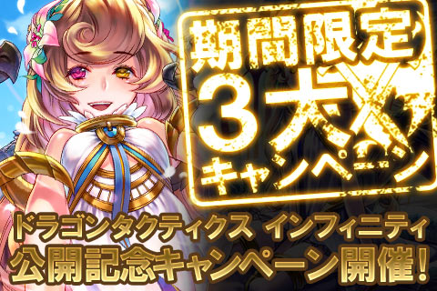 株式会社enish(本社:東京都渋谷区、代表取締役社長:杉山 全功、以下「エニッシュ」)は、配信中のネイティブアプリゲーム『ドラゴンタクティクス∞(インフィニティ)』において、SNS連動型の3大キャンペーンを本日2013年11月21日(木)より開始いたします。今回のキャンペーンでは、達成内容に応じて各種アイテムやガチャチケ・SRカードなど、数々のお得な特典をご用意しています。ぜひお楽しみください。
