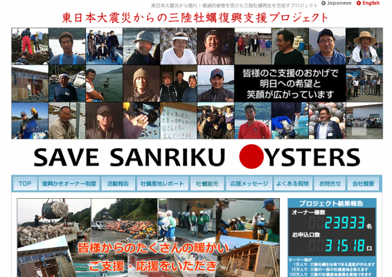 国内最大級の牡蠣のネットショップ旨い牡蠣屋(http://umaikaki.com)を運営し、2011年3月26日に復興牡蠣支援プロジェクト(http://sanriku-oysters.com)を立ち上げ、オーナー制度を利用して三陸の牡蠣生産者に養殖資材などを支援しました。