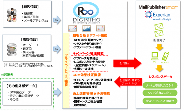 2013.11.26 - エクスペリアンジャパン株式会社(本社:東京都港区、代表取締役:有田道生、以下エクスペリアンジャパン)が提供するメール配信システム「MailPublisher Smart Edition(以下MailPublisher Smart)」は、株式会社デジミホ(本社:東京都千代田区、代表取締役:加來幹久、以下デジミホ)が提供するロイヤル顧客・マネジメント・プラットフォーム「R∞(アール・エイト、以下、R∞)」との連携を開始いたしました。
