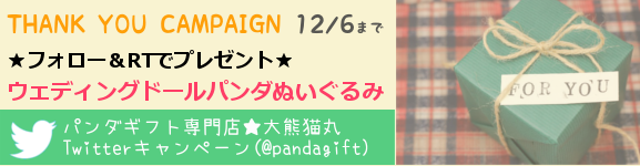 2013/12/6までに、パンダギフト専門店★大熊猫丸(ぱんだまる)公式Twitterアカウント@pandagift(http://twitter.com/pandagift)をフォローし、対象のツイートを公式リツイートされた方の中から、抽選で1名様に「ウェディングドールパンダぬいぐるみ」をプレゼント致します。