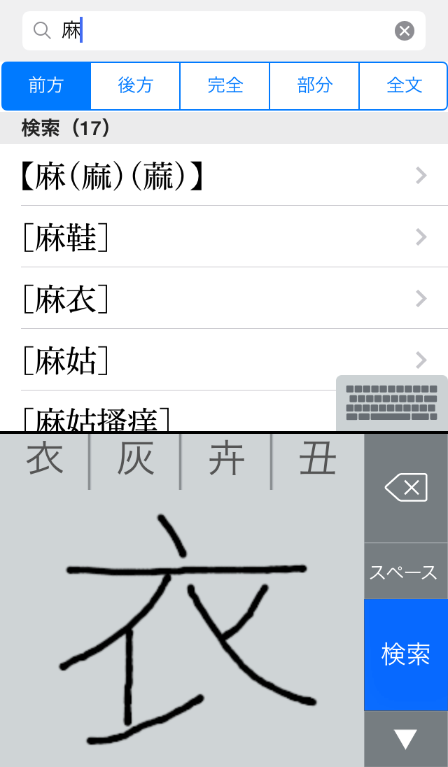 ●豊富な検索オプションを用意(前方一致 / 後方一致 / 完全一致 / 部分一致 / 全文検索)。それぞれの検索方法で、文字を入力すると候補見出し語が表示されるインクリメンタルサーチに対応。(部分一致、全文検索を除く)用語をうろ覚えでも検索が容易です。さらに区点コード、補助漢字コード、ユニコードでも検索ができます。