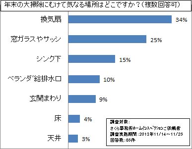 業界初の個人向け不動産コンサルティング・ホームインスペクション (住宅診断)を提供している “不動産の達人 株式会社さくら事務所” (東京都渋谷区/代表:大西倫加)では この度、同社ホームインスペクション依頼者の皆さまに、 年末の大掃除はどこが気になっているかのお悩みアンケート調査を実施。 集計結果をお知らせいたします。