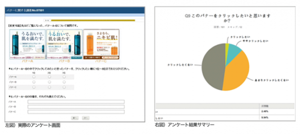 本サービスでは、約168万人(2013年8月末時点)のアンケートモニターの管理・運用を行なう株式会社リサーチパネル(東京都渋谷区、代表取締役:漆崎 理也)のアンケート会員の中から、本配信に近しいセグメントで対象の会員を抽出し、「バナーに関するアンケート」を配信します。最短1日で数値結果とともに情報量に富む「言葉による意見」の収集および集計が可能です。また、こうした調査サービスとしては安価な1回5万円(※1)から実施することができ、広告配信の前後を問わず、好きなタイミングで利用することができます[2] 。一発勝負の高額な広告枠に対するクリエイティブであれば、保険を兼ねた事前テストとして。配信後の原稿であれば、結果をより深く推察するための材料を得るためのツールとして活用することが可能です。