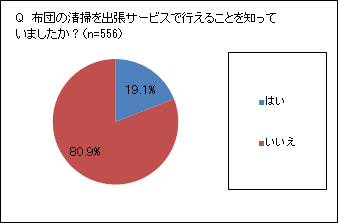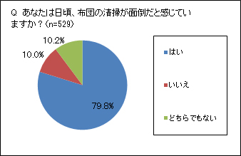 有限会社ナルセ(本社:埼玉県桶川市、代表取締役:成瀬 研)は、2013年11月28日に布団に関するアンケート(※1)の結果を公開しました。調査結果からは、「布団の清掃が面倒だと感じていますか?」の問いに対して、8割の人が「はい」と回答。一方、「布団清掃の出張サービスを知っていましたか?」の問いに対して「はい」と回答した人は2割しかおらず、布団清掃は面倒くさいが自分でやるしかないと思っている人が大半だという結果となりました。布団清掃を依頼する際に気にするのは「金額」と答えた方が82.4%と断トツで、「作業の時間」が40.1%と続いた。