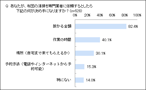 有限会社ナルセ(本社:埼玉県桶川市、代表取締役:成瀬 研)は、2013年11月28日に布団に関するアンケート(※1)の結果を公開しました。調査結果からは、「布団の清掃が面倒だと感じていますか?」の問いに対して、8割の人が「はい」と回答。一方、「布団清掃の出張サービスを知っていましたか?」の問いに対して「はい」と回答した人は2割しかおらず、布団清掃は面倒くさいが自分でやるしかないと思っている人が大半だという結果となりました。布団清掃を依頼する際に気にするのは「金額」と答えた方が82.4%と断トツで、「作業の時間」が40.1%と続いた。