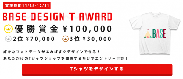 BASE株式会社(代表:鶴岡裕太/東京都港区)は2013年11月29日(金)、ネットショップを無料で簡単に作ることができる『BASE(ベイス)』( https://thebase.in/ )にてTシャツ作成Appsを使ったオリジナルデザインTシャツで参加することができるキャンペーン「BASE DESIGN T AWARD」( http://thebase.in/t-award )を開催しました。最も多くの人気票を集めた上位3つのTシャツデザイナーには最大20万円が贈呈されます。