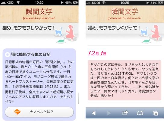 『瞬間文学』はナノベル作家が書き下ろした150文字で積み重ねる短編小説を「瞬間日記」で約1ヶ月間に渡り日々提供、それを前後半にまとめた小説はナノベルアプリ上で読むことができます。