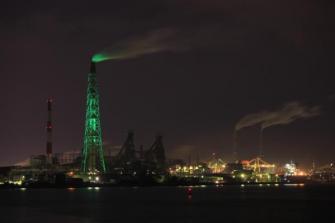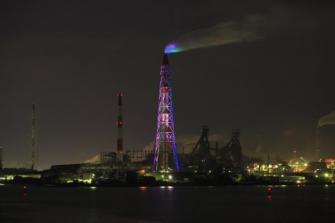 操業中の煙突にフルカラーチェンジの投光器で投射するという、