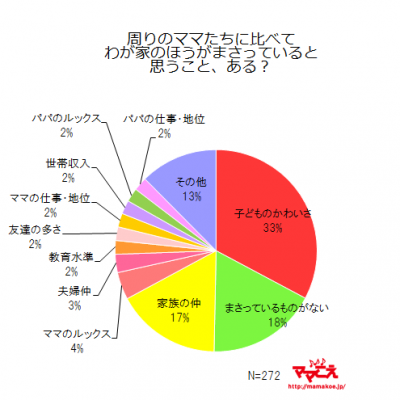 ママたちに、「周りのママたちに比べてわが家のほうがまさっていると思うこと、ある?」(n=272)と聞いたところ、「子どものかわいさ」(33%)がトップ。「親ばかだけど……」といいつつも、やっぱりママの自慢は子どもなのだとわかる回答になりました。