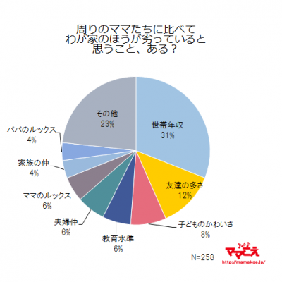 では、「周りのママたちに比べてわが家のほうが劣っていると思うこと、ある?」(n=258)と聞いたところ、約3割のママが「世帯年収」(31%)と答えました。とはいえ他のママの収入と比較しているわけではなく、戸建の有無や車のランク、自分の節約具合、子どもの習い事の数などからそう感じているようです。次点に「友達の多さ」(12%)がランクイン。「子どもが生まれて家族以外と出かけなくなった」というもの一因のようです。ママにとってこの2つの項目は、普段から気になりやすいものなのかもしれません。