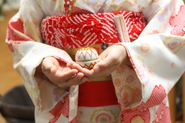 紅を刷く器は、幸福のシンボルとされる手毬をデザインした、有田焼の器を使用しています。