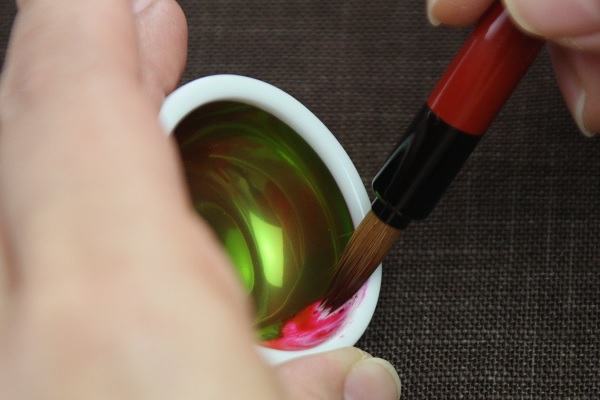 山形県産の紅花から、職人が何十工程もかけて、わずか1%しか含まれていない赤色の天然色素だけを抽出し、器に刷いて(塗って)仕上げます。