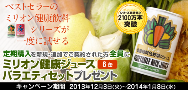 無臭ニンニク健康補助食品として27年のロングセラー商品「ミリオンパワー」、そして健康に配慮した「ミリオン健康飲料シリーズ」などを販売するミリオン株式会社(埼玉県さいたま市)は、12月2日~1月8日までの間に、「定期購入」を新規契約していただいた方を対象に、”選べるお得なプレゼントキャンペーン”を実施します。この機会に、ミリオンのお得な定期購入をご利用下さい。