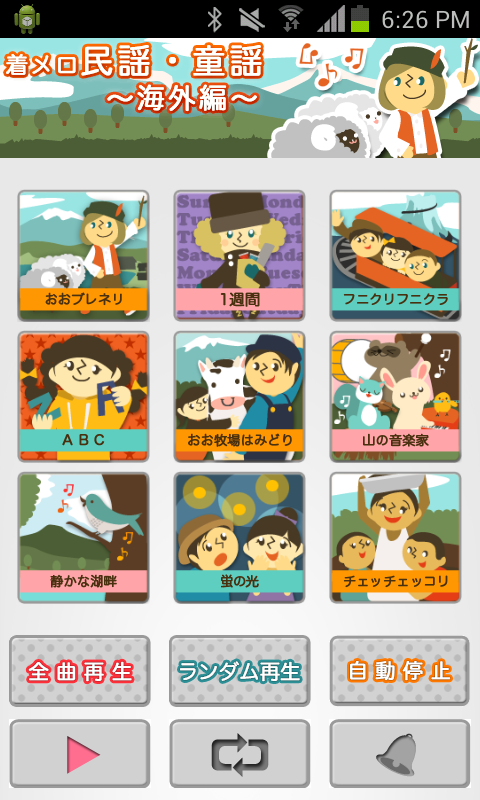 「着メロ民謡・童謡~海外編~」は、Android端末にて親子のふれあいにピッタリの童謡定番曲を再生できるアプリケーションです。ご好評いただきシリーズの第7弾、今回も海外の育児の場面でもご使用頂けるよう英語対応しました。幼稚園や保育園、親子で一緒に楽しく歌える定番の童謡を、高音質の着メロで収録しています。かわいい絵をタッチするだけで簡単再生。