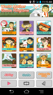 「着メロ民謡・童謡~海外編~」は、Android端末にて親子のふれあいにピッタリの童謡定番曲を再生できるアプリケーションです。ご好評いただきシリーズの第7弾、今回も海外の育児の場面でもご使用頂けるよう英語対応しました。幼稚園や保育園、親子で一緒に楽しく歌える定番の童謡を、高音質の着メロで収録しています。かわいい絵をタッチするだけで簡単再生。