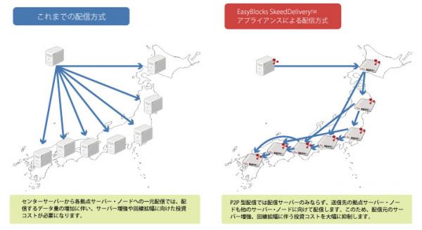 EasyBlocks SkeedDelivery(TM)アプライアンスは、株式会社Skeedのソフトウェアを採用することで、情報を分散して連鎖的に配信し、中央の配信元サーバーの負荷や回線ネットワークの増強コストを最小限に抑えながら、多拠点へのコンテンツ配信を超高速で実現します。