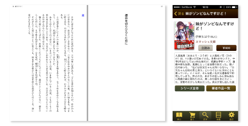 購入したタイトルはすべて<本棚>に格納。電子書籍を読むときには、文字サイズや明るさなどの調整が自在で、気に入ったフレーズ等はSNSで共有することもできます。