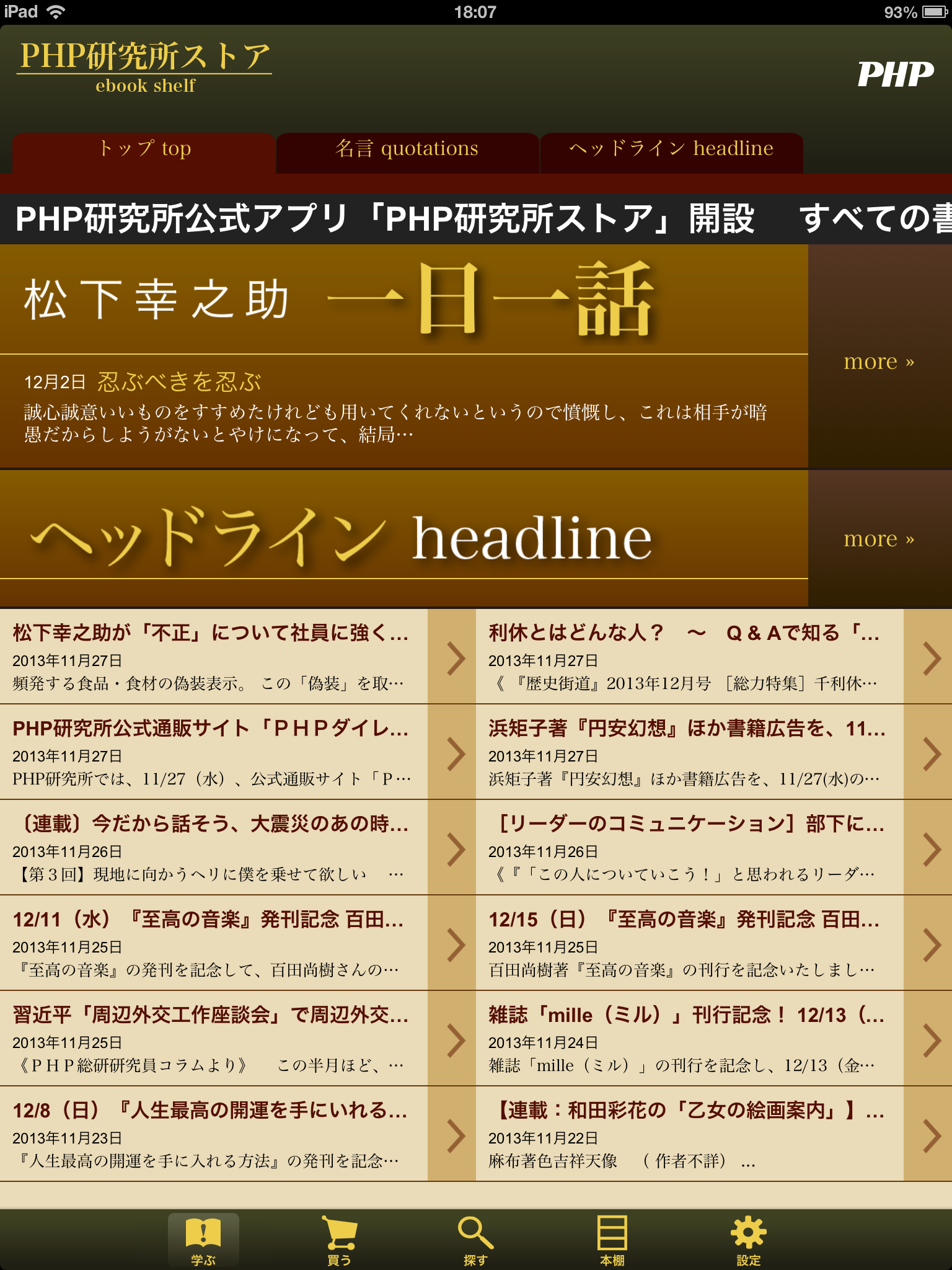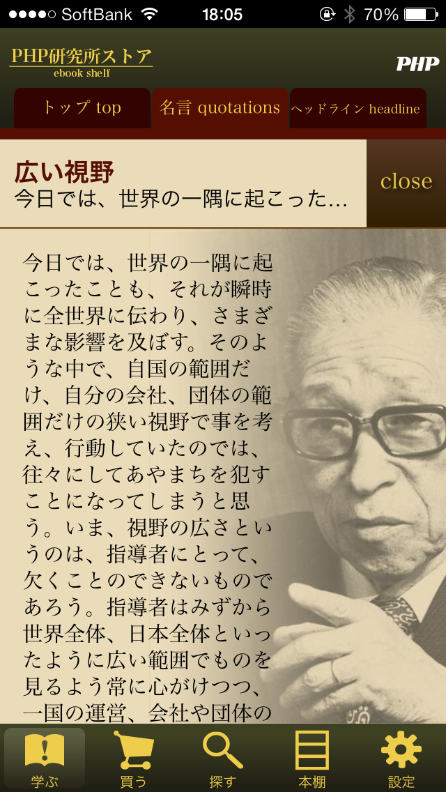 ビジネスリーダーのための自己啓発サイト「PHPビジネスオンライン衆知」の最新記事をアプリ内で配信。あわせて松下幸之助の思想・哲学を「一日一話」形式にまとめた語録も365日お届けします。
