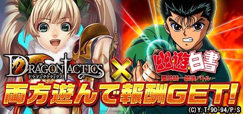 株式会社enish(本社:東京都渋谷区、代表取締役社長:杉山 全功、以下「エニッシュ」)の提供するソーシャルゲーム『ドラゴンタクティクス』は、メディアインクルーズ株式会社(本社:岡山県岡山市、代表取締役社長:小川 昌幸、以下「メディアインクルーズ」)の提供する『幽☆遊☆白書 -魔界統一最強バトル-』とコラボし、本日2013年12月11日(水)よりキャンペーンを実施します。各種ガチャチケ・各種アイテム入手のチャンスとなりますので、ぜひお楽しみください。