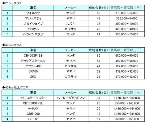 オークネットバイクオークションにおける成約台数を集計し、排気量別ランキングベスト5を まとめました。
