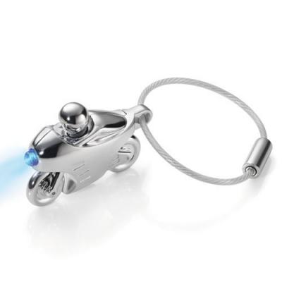 オートバイをかたどったチャームの先端にLEDライトを埋め込んだキーリング。ライダーのヘルメットを押すと、ブルーのLEDライトが点灯。手元を明るく照らしてくれます。