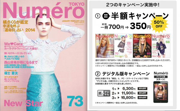 Numero TOKYOでは、オンライン書店「富士山マガジンサービス」と提携し、年間3500円(通常7000円×10冊分=7000円)となる期間限定の半額キャンペーンを実施中! 期間は2014年3月31日までのお申し込みになります。
